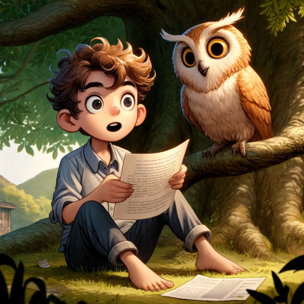 جلس الطفل يحيى، الصحفي الفضولي، بجانب صديقته البومة حكيمة تحت ظل شجرة كبيرة. كان يحمل دفتره ويستعد لتدوين ملاحظاته بينما كانت البومة تقرأ بصوت هادئ من ورقة علمية.